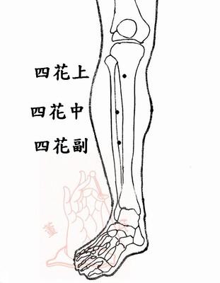 四花穴定位就是膝眼下3寸即足三里内侧一寸为上穴,上穴往下4.5寸为中穴,中穴往下2.5寸为副穴,副穴再往下2.5寸为下穴。